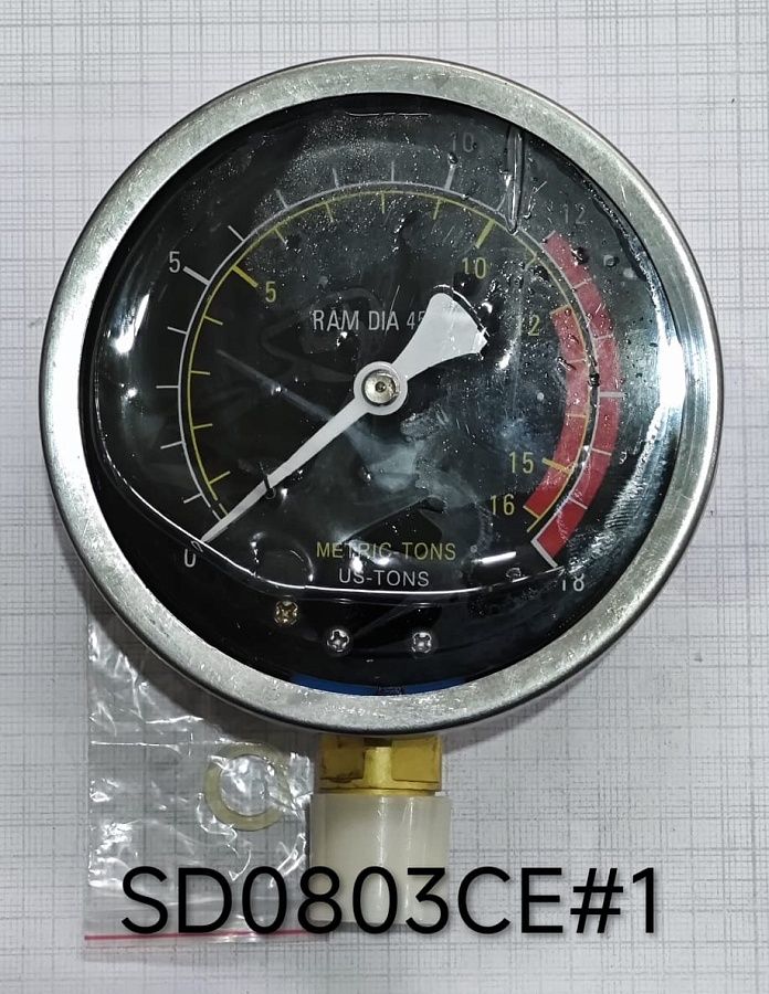 Размер резьбы: М20х1,5.  Рабочее давление: 12т.  Максимальное допустимое давление: 16т. Цена деления шкалы: 1т. Применяемость к прессам: SD0803