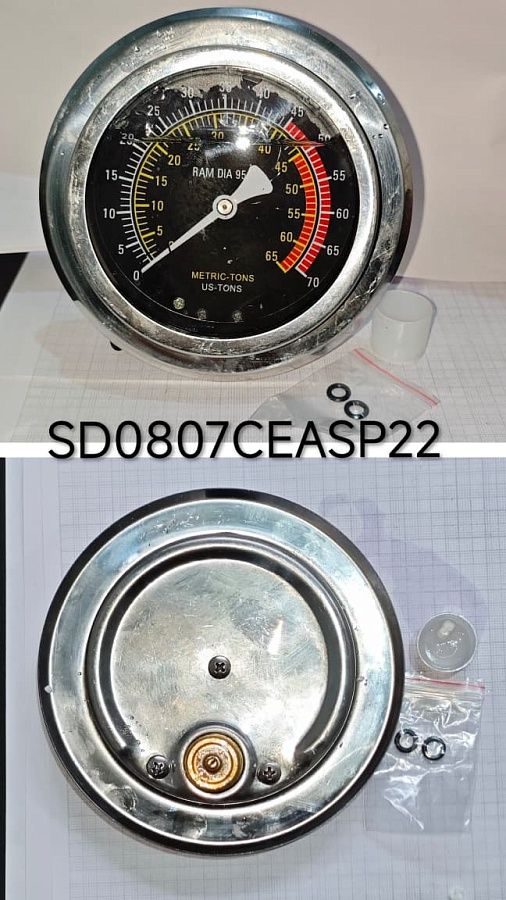Размер резьбы: М20х1,5.  Рабочее давление: 45т.  Максимальное допустимое давление: 65т. Цена деления шкалы: 1т. Применяемость к прессам:  SD0807СЕА