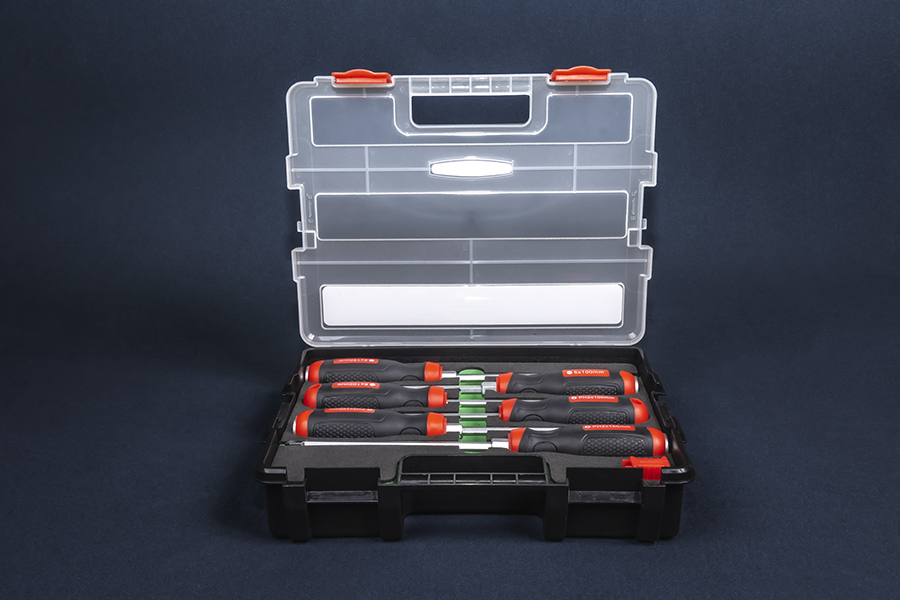 Набор отверток 6 предметов изготовлен из высококачественной легированной хром-ванадиевой инструментальной стали, с последующей закалкой до твердости в пределах 46-48HRC, что соответствует всем требования нормативной документации. Наконечник проходят дополнительную термическую обработку с целью получения оптимального сочетания твердости и пластичности. Стержень имеет глубокую посадку с крепление в двух точках, что исключает проворачивание стержня в рукояти. Отвертка снабжена двухкомпонентной эргономичной рукоятью. Благодаря высококачественным компонентам рукоять имеют высокую стойкость к агрессивным средам.