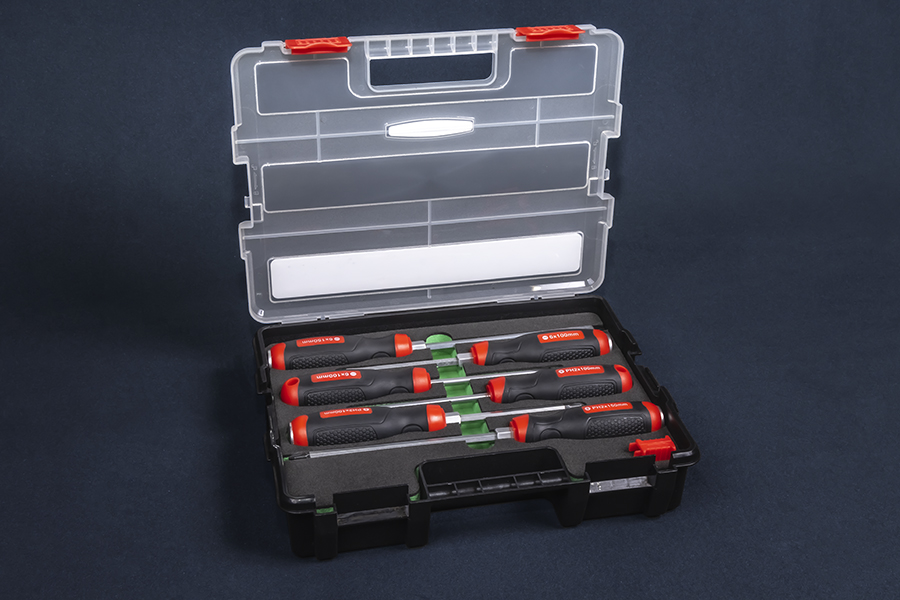 Набор поставляется в облегченном пластиковом кейсе. Этот кейс обладает уникальным свойством: в каждый набор вложены специальные пластиковые клипсы, с помощью которых, купив еще один кейс с другим набором инструмента, можно надежно соединить 2 кейса и получить отличную систему хранения, также удобную для дальнейшей эксплуатации и транспортировки. Ложемент EVA имеет высокую устойчивость к механическим воздействиям и влиянию ГСМ. Благодаря этому, он жестко фиксирует инструменты, быстро восстанавливает форму при деформации, не разлагается под действием масел и других веществ.