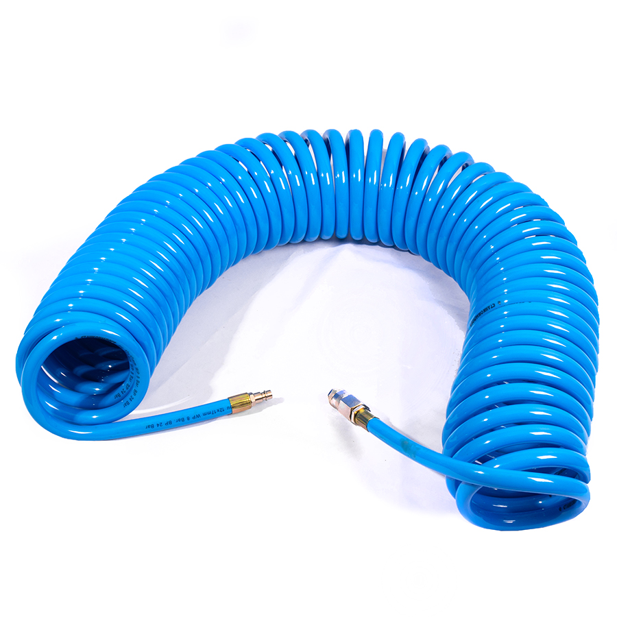 Шланг воздушный спиральный применяется для подачи воздуха от компрессора или линии сжатого воздуха к пневмоинструменту. За счет своей формы в виде спирали, шланг имеет достаточно компактный размер и не мешается под ногами.