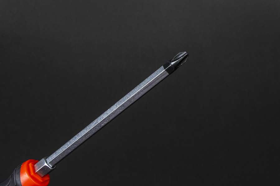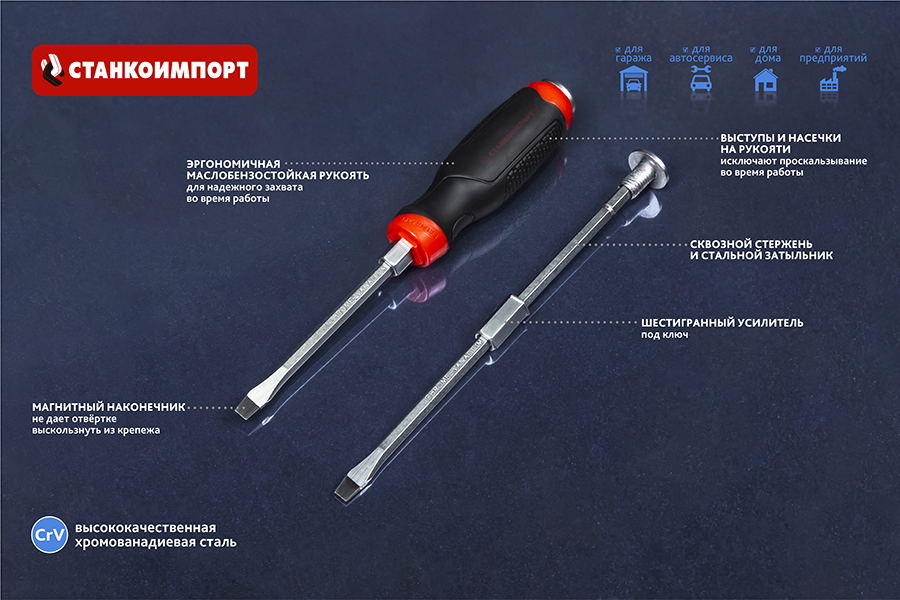Отвертка изготовлена из высококачественной легированной хром-ванадиевой инструментальной стали, с последующей закалкой до твердости в пределах 46-48HRC, что соответствует всем требования нормативной документации. Наконечник проходит дополнительную термическую обработку с целью получения оптимального сочетания твердости и пластичности. Сквозная посадка стержня и металлический затыльник позволяют применять ударное воздействие. Шестигранный профиль у основания рукояти позволяет посредством ключа существенно увеличить усилие, передаваемое крепежу. Отвертка снабжена двухкомпонентной эргономичной рукоятью. Благодаря высококачественным компонентам рукоять имеют высокую стойкость к агрессивным средам.
