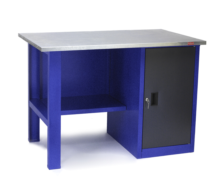 Основание верстака изготовлено из высокопрочного листового металла, а столешница из фанеры толщиной 24 мм, обшитой оцинкованным металлом толщиной 1 мм. Прочная конструкция верстака позволяет выдержать нагрузку на столешницу до 300 кг.
