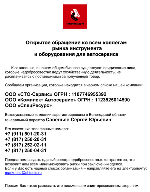 в связи с неприятной ситуацией, связанной с недобросовестным сотрудничеством со стороны бывших клиентов компании "Станкоимпорт", мы хотим поделиться с вами важной информацией.
