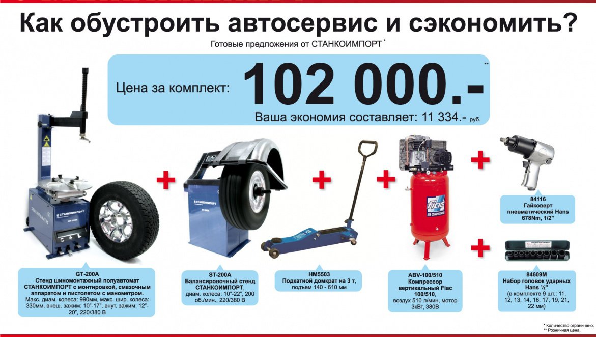 Шиномонтажный стенд и балансировочный стенд, подкатной домкрат и автомобильный компрессор вертикальный, пневматический гайковерт и набор ударных головок - все в одном комплекте по невероятной цене - всего 102 000 рублей!